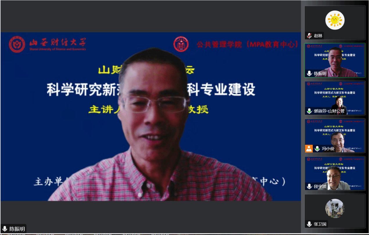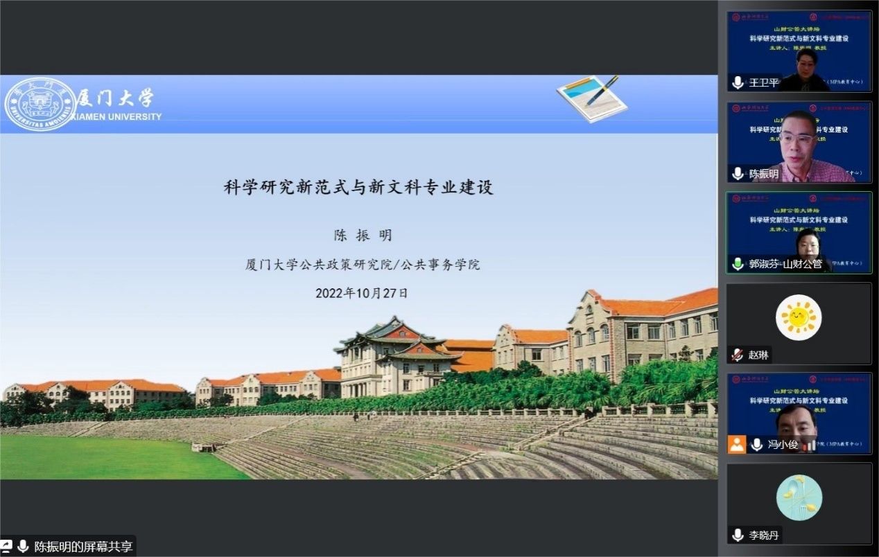 2022年10月27日,由无码直播 主办的“山财公管大讲坛”正式开讲,厦门大学公共政策研究院教授兼院长、厦门大学社会科学学部主任、“长江学者”特聘教授陈振明拨冗莅临第一讲做了题为“科学研究新范式与新文科专业建设”的报告。校党委副书记、公共管理一级学科带头人王卫平教授主持了本次大讲坛。来自校内外的300余名师生线上聆听了报告。