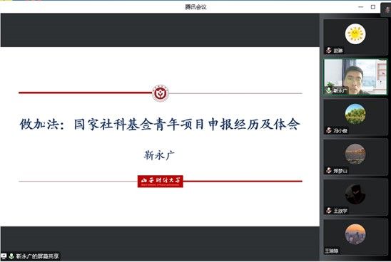 通过“尚公青年沙龙”学术平台举办第五场国家级科研项目申报经验交流会, 学院2022年国家社科基金项目主持人靳永广博士做了《国家社科基金青年项目申报经历及体会》的报告,副院长冯小俊主持了交流会,100余名师生在线参加了经验交流会。