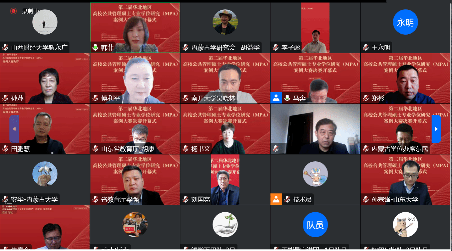 在全国上下学习宣传贯彻落实党的二十大精神之际,为贯彻落实《专业学位研究生教育发展方案(2020—2025)》(学位〔2020〕20 号)精神,深化MPA教育改革创新,提高专业学位研究生人才培养质量,华北五省市(自治区)联合举办的第二届华北地区高校公共管理硕士专业学位硕士研究生(MPA)案例大赛决赛于2022年12月11日在腾讯会议平台如期举行。本次决赛由教育部学位管理与研究生教育司、教育部学位与研究生教育发展中心、全国公共管理专业学位研究生教育指导委员会指导,山东省教育厅、天津市教育委员会、河北省教育厅、山西省教育厅、内蒙古自治区教育厅联合主办,山东大学、山东学位与研究生教育学会承办。
