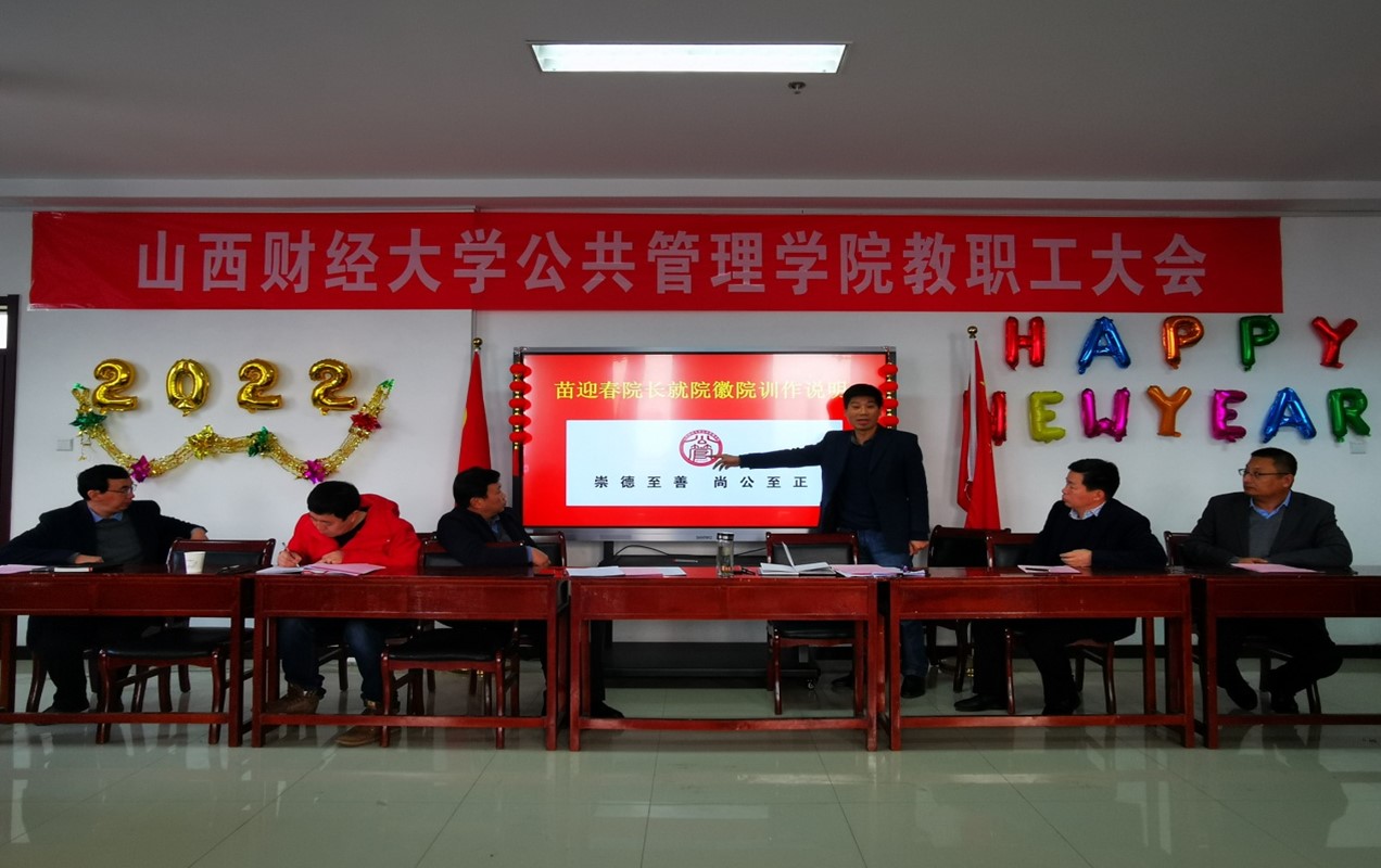 在学院会议室召开教职工大会。学院党委书记董军伟、院长苗迎春、副书记梁兴凯、副院长王宏伟、冯小俊、段宇波以及全院50余名教职工参加会议。会议由学院党委副书记梁兴凯主持。
