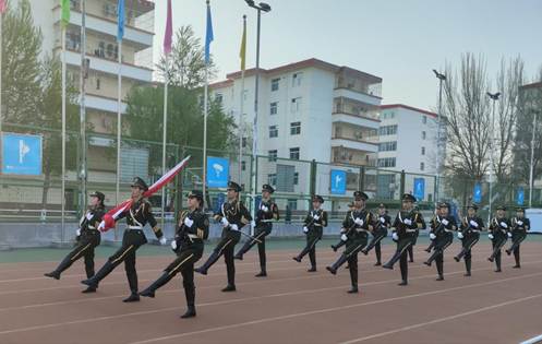 早晨7时整,升旗仪式正式开始。迎着春日的骄阳,校国旗班的护旗手们着装整齐、步伐矫健,护送鲜艳的五星红旗走向国旗台。伴随着嘹亮的《义勇军进行曲》,全场师生庄严肃立,向国旗敬礼,五星红旗冉冉升起,迎风飘扬,雄壮的国歌声响彻校园上空。